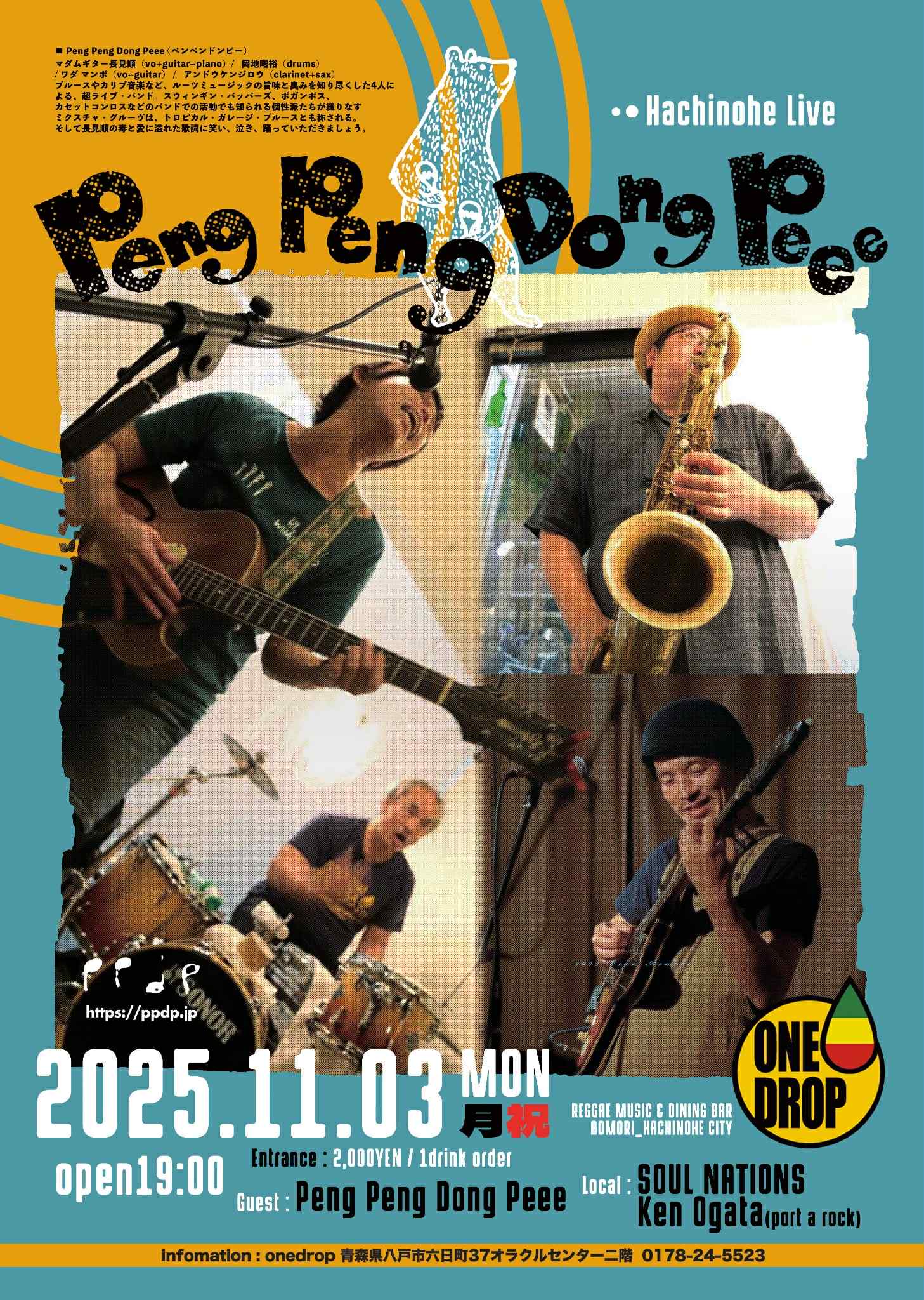 ■ 2025.11.03 mon PENG PENG DONG PEEE 八戸 ONE DROP 〒031-0033 青森県八戸市六日町37 オラクルセンター 2F OPEN 19:00 CHARGE 2000yen (+1drin)