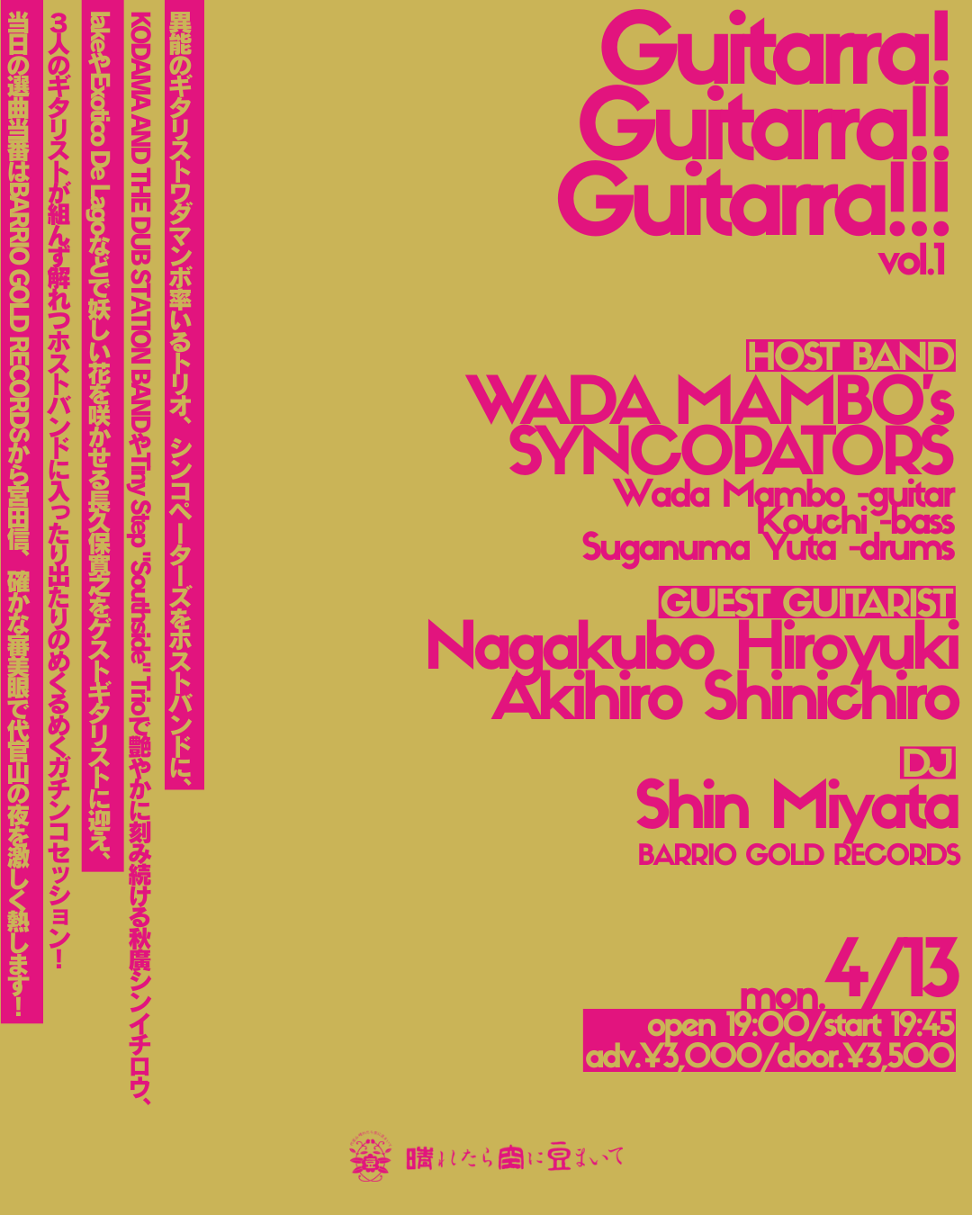 ■ 2026.04.13 mon SYNCOPATORS 代官山 晴れたら空に豆まいて Guitarra! Guitarra!! Guitarra!!! vol.1 [出演] Host Band◎ WADA MAMBO’s SYNCOPATORS WADA MAMBO -Guitarra Kouchi -Bass 菅沼雄太 -Drums Guest Guitarist◎ 長久保寛之 -Guitarra 秋廣シンイチロウ -Guitarra DJ◎ 宮田信 -Barrio Gold Records